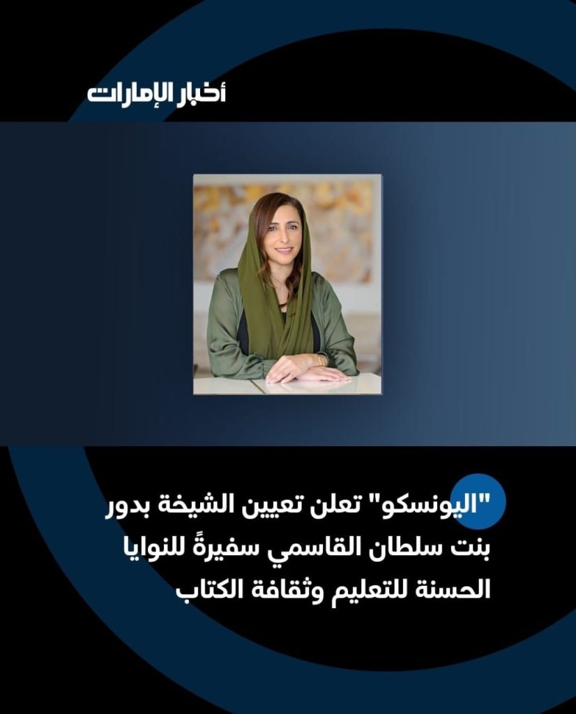 في خطوة نوعية تَشْهدها مسيرة الثقافة والتعليم الإماراتيّة، تمّ تعيين الشيخة بدور بنت سلطان القاسمي سفيرة للنوايا الحسنة للتعليم وثقافة الكتاب لدى اليونسكو. وتُعَدّ هذه الخطوة تتويجاً لمسار حافل بالإنجازات في المجالات الثقافية والتربوية في دولة الإمارات العربية المتحدة، الأمر الذي يستحق التوقف عنده – وفيما يلي عرض موجز لأبرز ما يمثّله هذا التكريم، وما تمثّله صاحبتُه من دور محفّز في الثقافة والتعليم.