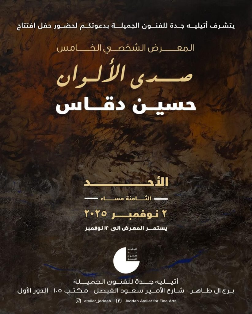 يستضيف أتيليه جدة للفنون التشكيلية المعرض الشخصي الخامس للفنان السعودي حسين دقاش يوم غد الأحد الموافق (2) نوفمبر … ومن جانبه أوضح الفنان التشكيلي الكبير هشام قنديل مدير أتيليه جدة أن المعرض سيستمر لمدة (10) أيام ويتبعه مباشرة سلسلة من المعارض الشخصية والجماعية أقربها معرض الفنان عبدالرحمن المغربي حيث سبق للفنان إقامة أربعة معارض شخصية في جدة والرياض ,كما شارك في العديد من المعارض الجماعية داخل المملكة وخارجها ونال من خلالها جوائز مهمة. و عن تجربته يقول الفنان حسين دقاش صدى الألوان .