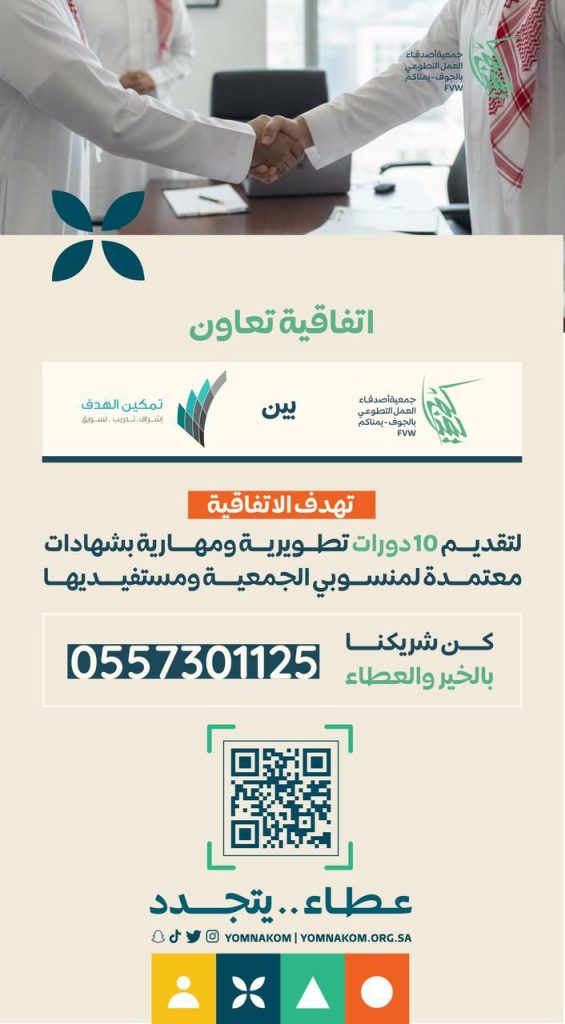 وقّعت جمعية أصدقاء العمل التطوعي بالجوف اتفاقية تعاون مع مركز تمكين الهدف للتدريب، تهدف إلى تنفيذ برامج تطويرية ومهارية معتمدة لمنسوبي الجمعية ومستفيديها، في إطار تعزيز قدرات المتطوعين وتأهيلهم بما يسهم في تنمية المجتمع.