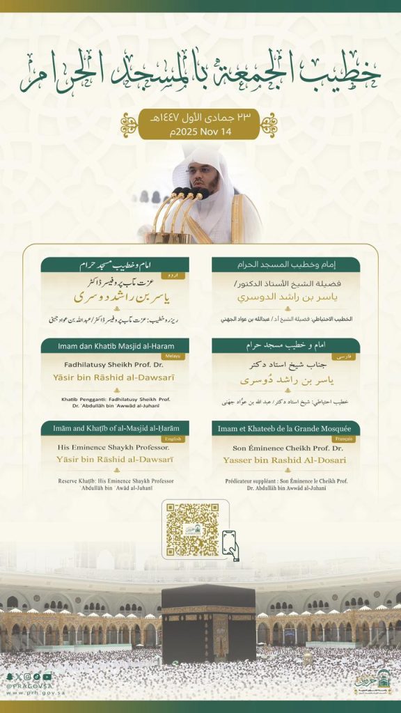 حددت رئاسة الشؤون الدينية بالمسجد الحرام والمسجد النبوي، خطيبا وأئمة صلاة الجمعة في الحرمين الشريفين ليوم بعد غد الجمعة 23 جماد الاولى1447هـ وذلك ضمن جدولها الدوري لتنظيم الإمامة والخطابة.