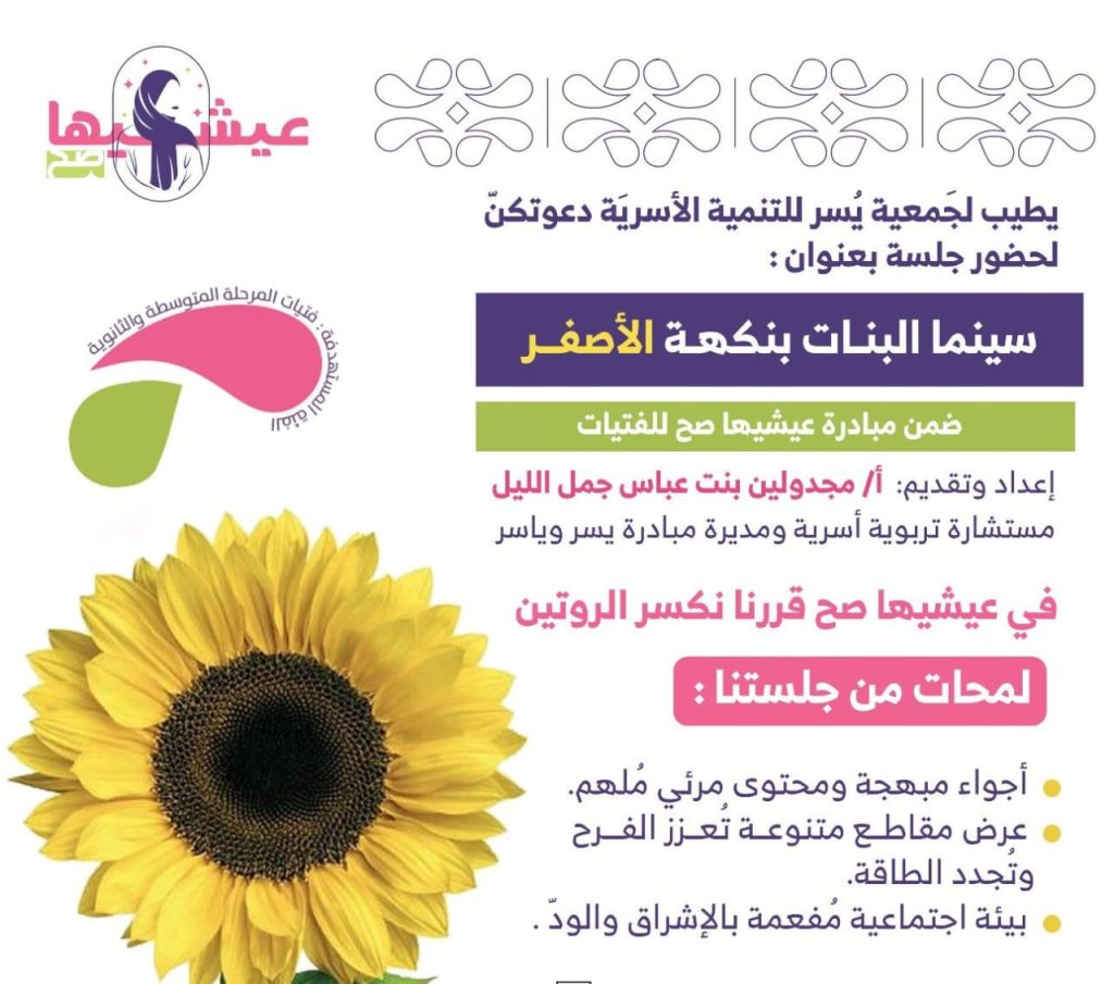 ضمن الأنشطة والبرامج التوعوية والتثقيفية التي تقيمها جمعية يُسر للتنمية الأسريَة بمكة المكرمة تنظم الجمعية برنامج بعنوان:( سينما البنات بنكهة الأصفر)