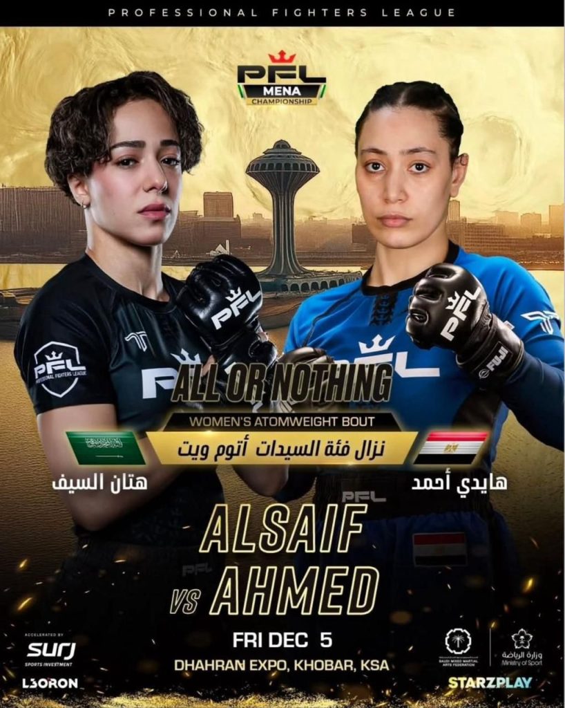 لنهائي دوري المقاتلين المحترفين، مع المقاتلة السعودية ” هتان السيف ” و المقاتلة ” هايدي أحمد ” من جمهوريه مصر العربيه علماً ان النهائي لدوري المقاتلين المحترفين بالشرق الأوسط بتاريخ 5 ديسمبر بالمنطقه الشرقيه وبالتوفيق لممثله الوطن المقاتله هتان السيف