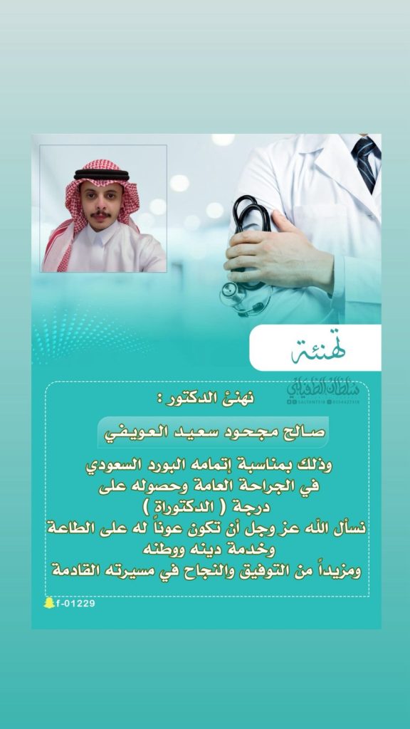 أحد أبناء محافظة قلوة، بمناسبة حصوله على البورد السعودي في الجراحة العامة ونيله درجة الدكتوراه، بعد رحلة علمية حافلة بالعطاء والتميّز.