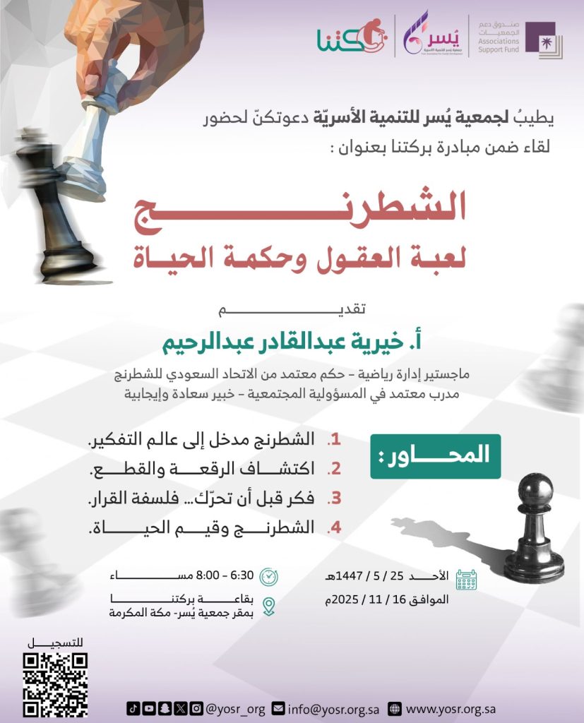 التوعوية والتثقيفية التي تقيمها جمعية يُسر للتنمية الأسريّة بمكة المكرمة تقيم الجمعية لقاء ضمن مبادرة بركتنا بعنوان: