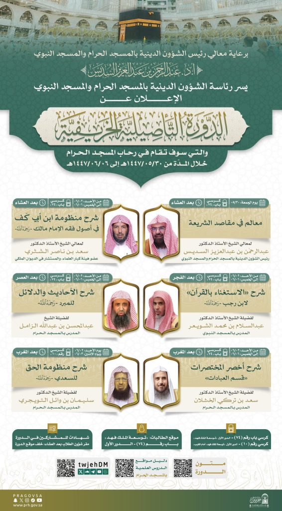 أوضحت رئاسة الشؤون الدينية بالمسجد الحرام والمسجد النبوي، ممثَّلةً في وكالة الشؤون العلمية والتوجيهية، عن أنطلاق الدورة التأصيلية الخريفية إبتداءً من يوم الجمعة القادم 30 جمادى الأولى 1447هـ، وحتى الجمعة 7 جمادى الآخرة 1447هـ، وذلك في توسعة الملك فهد –رحمه الله– بالمسجد الحرام.
