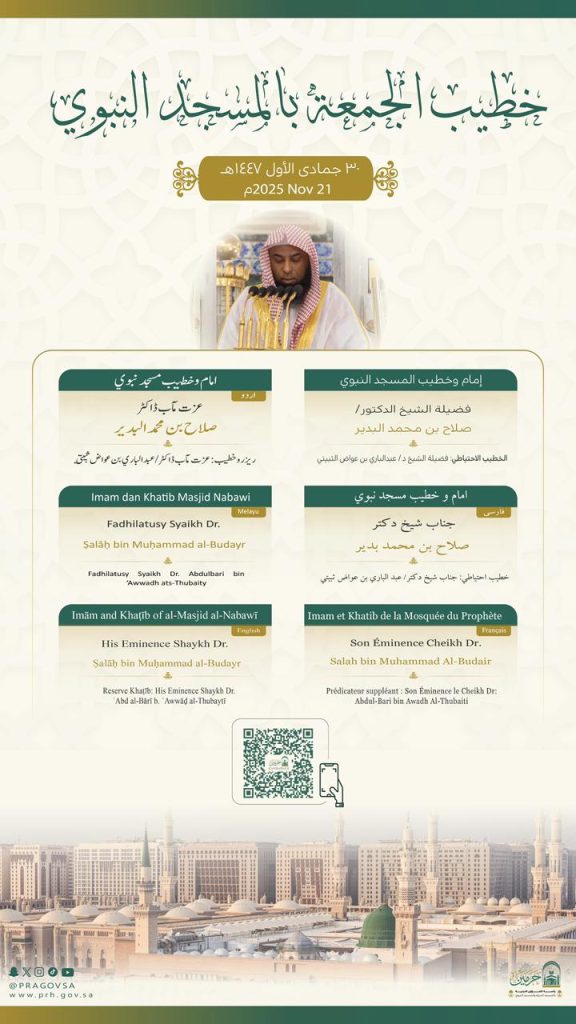 حددت رئاسة الشؤون الدينية بالمسجد الحرام والمسجد النبوي، خطيبا وأئمة صلاة الجمعة في الحرمين الشريفين 30 جماد الاولى1447هـ وذلك ضمن جدولها الدوري لتنظيم الإمامة والخطابة.