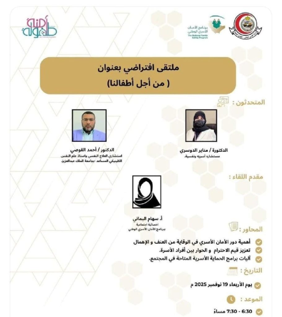 في إطار جهودها التوعوية وبرامجها الهادفة لحماية الطفل وتعزيز استقرار الأسرة، نظّمت جمعية طفولة آمنة مساء أمس الأربعاء ملتقى (من أجل أطفالنا)، وذلك بالشراكة مع برنامج الأمان الأسري الوطني.