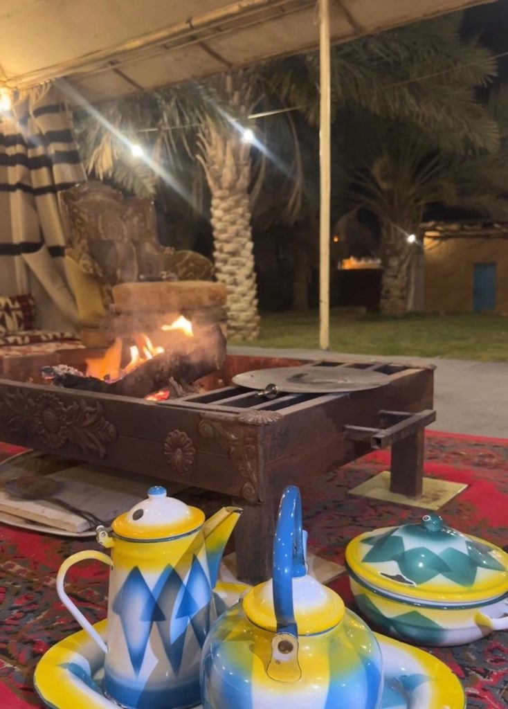 جلسنا نتناول الشاي والقهوة، ونتسامر حديثًا وضحكًا، في جلسات سمر دافئة تحيطها الفعاليات اللطيفة ورائحة الحطب التي تزيد المكان جمالًا على جماله. مضى الوقت من دون أن نشعر، حتى حان موعد العشاء، ثم ودّعنا هذا اليوم الجميل بإقفال المزرعة وانطلاق كلٍ منّا إلى بيته.