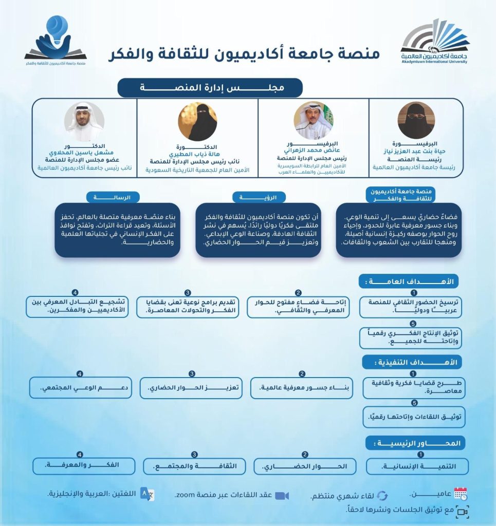 وجاء تشكيل مجلس إدارة المنصة برئاسة البرفسور حياة عبدالعزيز نياز، وبمشاركة البرفسور عايض محمد الزهراني رئيس مجلس الإدارة، وعضوية كل من الدكتورة هالة ذياب المطيري والدكتور مشعل ياسين المحلاوي، بما يعكس تكاملاً علميًا يدعم رسالة المشروع ويعزّز توجهاته الثقافية والمعرفية.