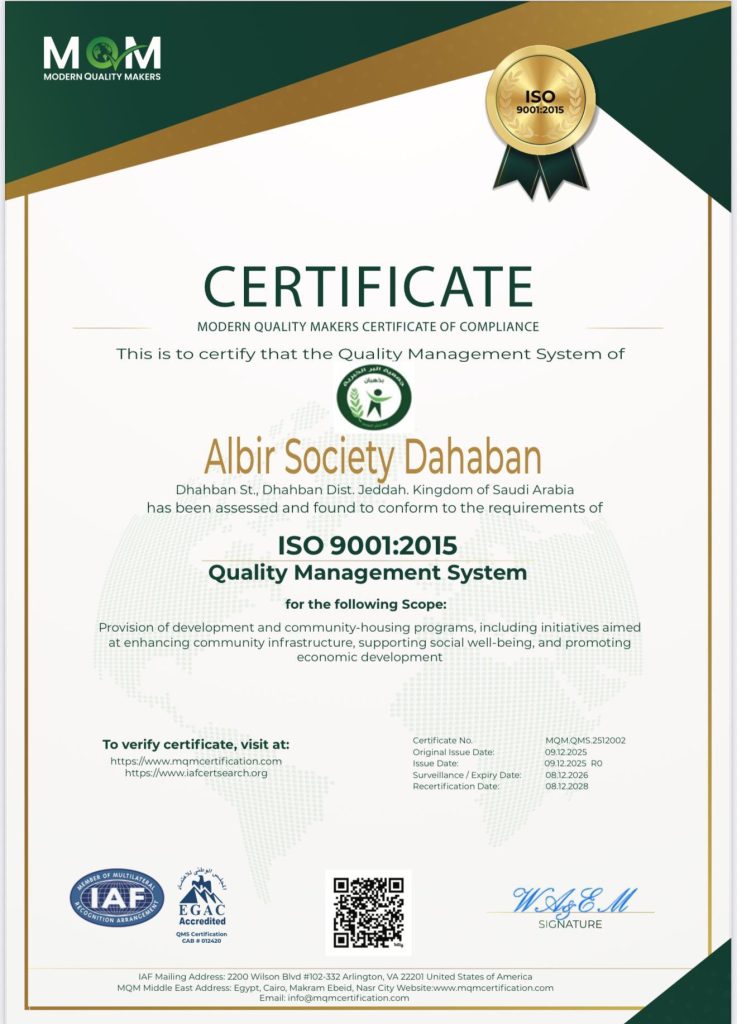 تُعرب جمعية البر الخيرية بذهبان عن فخرها واعتزازها بحصولها على شهادة ISO 9001:2015، والتي تُعد من أهم المعايير العالمية في إدارة الجودة. ويأتي هذا الإنجاز انطلاقًا من حرص القائمين على الجمعية على تطوير الأداء المؤسسي، والارتقاء بمستوى الخدمات المقدمة للمستفيدين، وتطبيق أفضل الممارسات لضمان الجودة والتحسين المستمر.