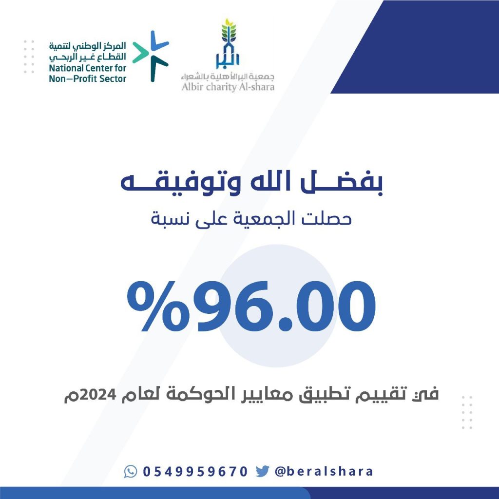 حققت جمعية البر الأهلية بالشعراء إنجازًا مميزًا بحصولها على تقييم عالٍ بنسبة 96.00% في تطبيق معايير الحوكمة لعام 2024م، وذلك ضمن التقييم المعتمد من المركز الوطني لتنمية القطاع غير الربحي.