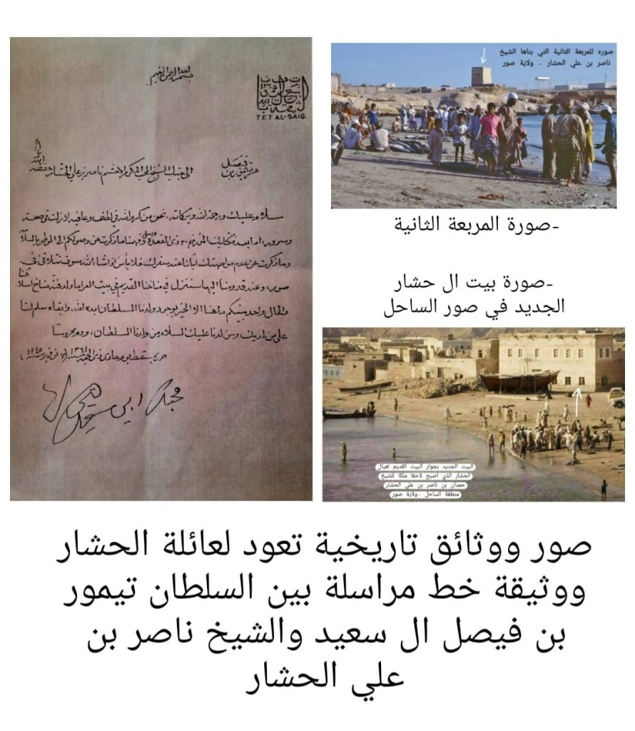 ج5 – اولا بالنسبة للفرضة كانت الحكومة أيام السلطان سعيد بن تيمور ومن قبله والده تيمور بن فيصل تسعى لإقامة جمارك ولكن الناس رفضت إقامة تلك الفرضة او الجمارك بحكم انها شئ جديد، وكانت أقامة الفرضة في وقتها ضروري في صور بحكم النشاط التجاري الكبير للحصول على الضرائب الجمركية من البضائع التي ترد الى صور حيث كانت صور ميناء تجاري هام و نشط بين سواحل الهند وافريقيا والخليج العربي، تكفلت بتنفيذ رغبة الحكومة طبعا بحكم العلاقة الوطيدة بين ال الحشار وحكومة الدولة البوسعيدية حيث تكفلنا باقامة اول جمارك في صور في بيت اخي الشيخ صالح بن علي الحشار وهو في منطقة الساحل بالقرب من بيوت عيال الحشار،فصار مقر الجمارك الاول في صور (مؤقتا)