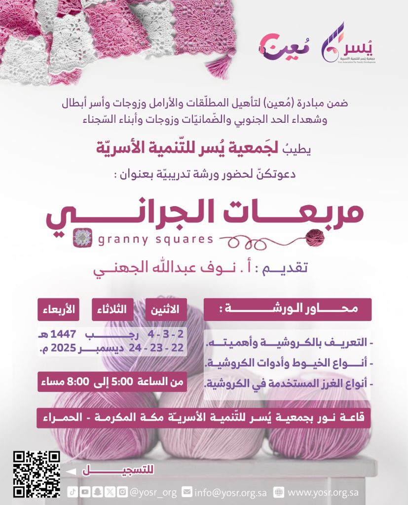 وتقام لقاعة نور بجمعية يُسر للتّنمية الأسريّة لمكة المكرمة – حي الحمراء.