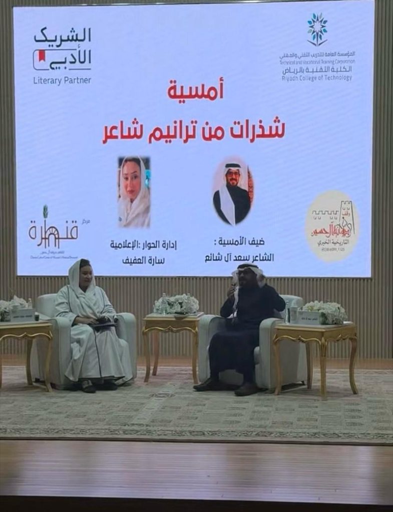وقدّمت الأمسية الإعلامية سارة العفيف، التي أضفت بحضورها الإعلامي المتمكن طابعًا أنيقًا على مجريات اللقاء، وأسهمت في إدارة الحوار بسلاسة، ما أتاح للجمهور الاقتراب أكثر من تجربة الشاعر ورؤيته الأدبية.