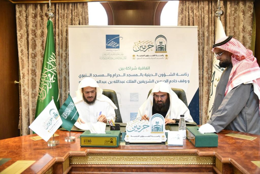 جرى توقيع اتفاقية شراكة بين وقف الملك عبدالله ورئاسة الشؤون الدينية بالمسجد النبوي، بحضور معالي رئيس الشؤون الدينية بالمسجد الحرام والمسجد النبوي الشيخ الأستاذ الدكتور عبدالرحمن بن عبدالعزيز السديس، وسعادة الأمين العام لوقف الملك عبدالله فضيلة الشيخ الدكتور عبدالباري بن عواض الثبيتي.