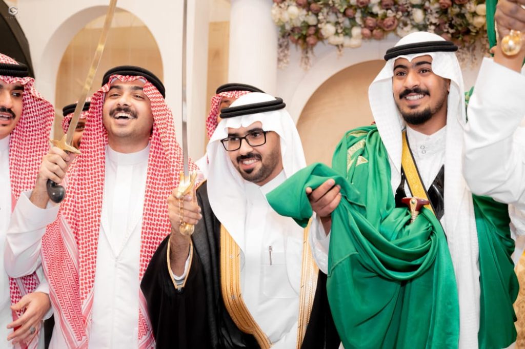 على انغام الفنون الشعبية لمنطقة جازان حيث رقص الأهل والاصدقاء والزملاء إبتهاجا وفرحا مع العريس