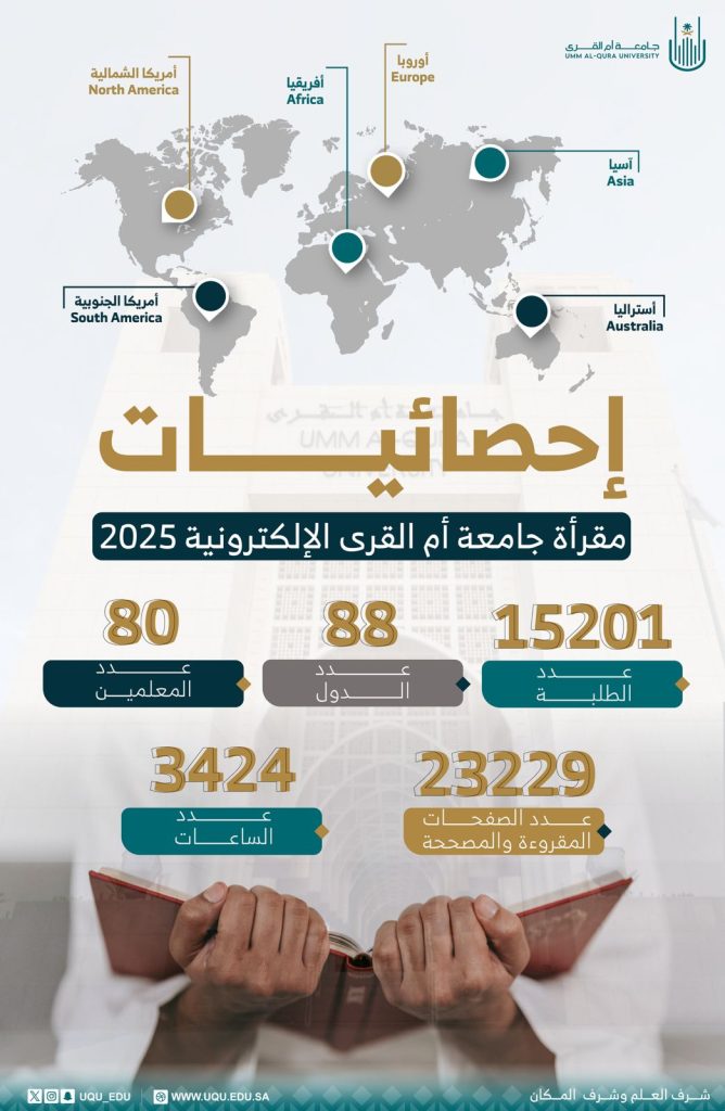 حقَّقت مقرأة جامعة أمِّ القرى الإلكترونية إنجازًا نوعيًّا خلال عام 2025م، في إطار رسالتها العلمية الهادفة إلى تعليم القرآن الكريم تلاوةً صحيحة؛ وفق أحكام التجويد، مع التصحيح الفوري للتلاوة على أيدي قرّاء ومعلمين ذوي خبرة وكفاءة علمية، وباستخدام تقنيات التعليم الإلكتروني الحديثة.