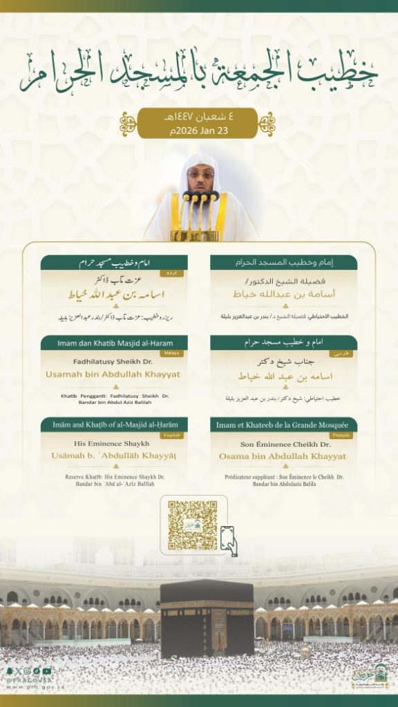 حددت رئاسة الشؤون الدينية بالمسجد الحرام والمسجد النبوي، أسماء خطيبا وإماما صلاة الجمعة في الحرمين الشريفين ليوم بعد غد 4 شعبان 1447هـ وذلك ضمن جدولها الدوري لتنظيم الإمامة والخطابة.