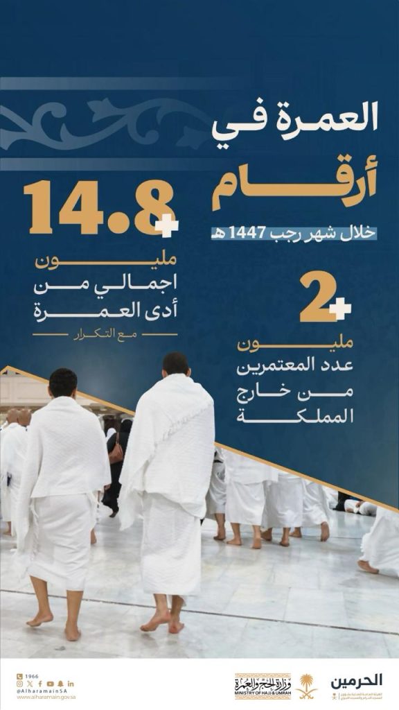 حيث بلغ عدد المعتمرين من خارج المملكة أكثر من مليونين معتمر