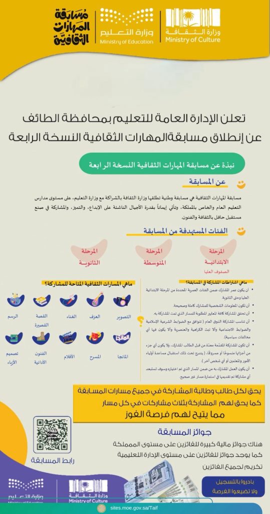 دعت الإدارة العامة للتعليم بمحافظة الطائف الطلاب والطالبات في المدارس الحكومية والأهلية والعالمية إلى التسجيل في النسخة الرابعة من مسابقة المهارات الثقافية، التي تضم عشرة مسارات متنوعة، تهدف إلى اكتشاف مهارات الطلبة وصقلها وتنميتها.