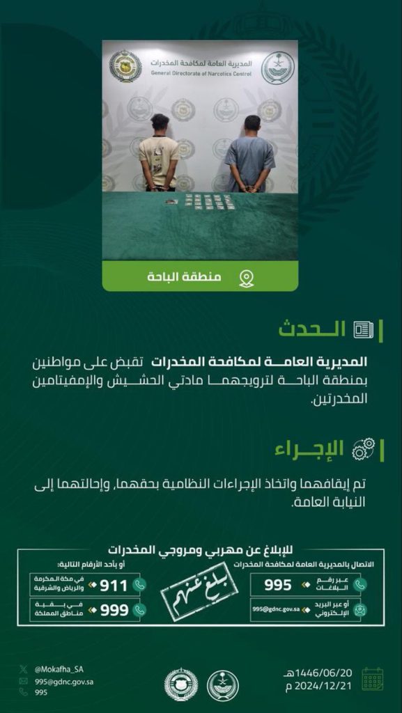 صرح المتحدث الرسمي للمديرية العامة لمكافحة المخدرات بأنه تم القبض على شخصين في منطقة الباحة، لترويجهما مادتي الحشيش والإمفيتامين المخدرتين.