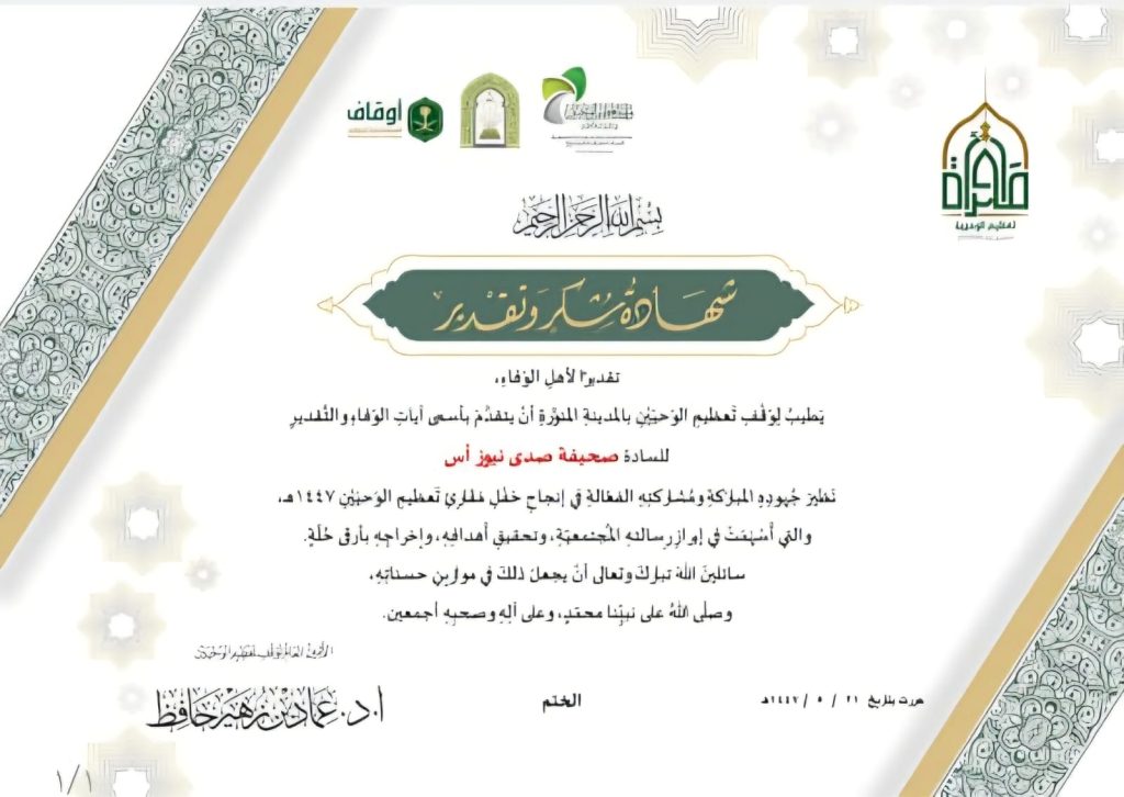نظير جهود الصحيفة المباركة ومشاركتها الفعالة في إنجاح مقرأة تعظيم الوحيين 1447هـ، والتي أسهمت في إبراز رسالتها المجتمعية، وتحقيق أهدافها، وإخراجها بأرقى حلة.”