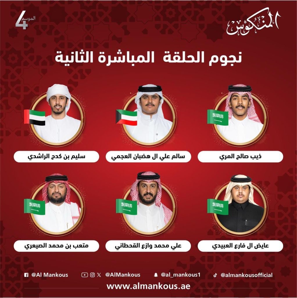 تعرض في التاسعة مساء غد «الإثنين» ثانية حلقات البث المباشر من برنامج «المنكوس» في موسمه الرابع، الذي تنظمه هيئة أبوظبي للتراث، بإطلالة جديدة تضم 6 نجوم من 3 دول (الإمارات، السعودية، الكويت)، يتنافسون على أداء لحن المنكوس، أحد الألحان الخليجية المرتبطة بالشعر النبطي.