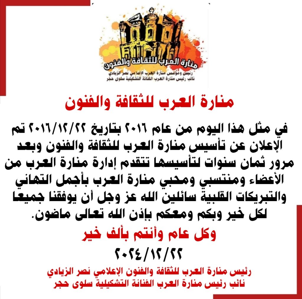 منارة العرب للثقافة والفنون لكل العرب الذي مقرها الأردن ورئيس منارة العرب الأستاذ نصر الزيادي ونائب الرئيس الأستاذة سلوى حجر وتضم منارة العرب العديد من الشعار و الرسمين والفن التشكيلي المثقفين من مختلف الوطن العربي