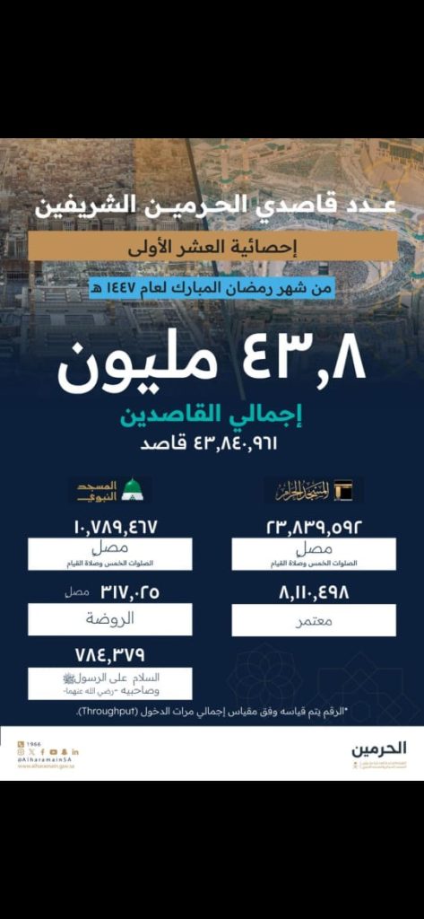أصدرت الهيئة العامة للعناية بشؤون المسجد الحرام والمسجد النبوي الشريف احصائيات عن العشر الأيام الأولى لشهر رمضان المبارك للعام الحالي 1447 هجرية لقاصدي الحرمين الشريفين بمكة المكرمة والمدينة المنورة وبلغت الاحصائيات أكثر من ٤٣,٨ مليون قاصد من داخل المملكة وخارجها