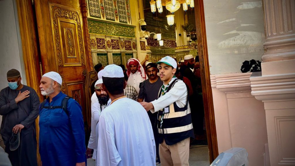 يواصل الفتية والشباب والقادة الكشفيون والقائدات المشاركون في معسكر الخدمة العامة بالمدينة المنورة لموسم رمضان 1447هـ، الذي تشرف عليه جمعية الكشافة العربية السعودية، الإسهام في تنظيم زوار الروضة الشريفة في المسجد النبوي، وذلك بالتعاون مع قوة أمن الحج والعمرة، ضمن منظومة متكاملة تهدف إلى تسهيل حركة الزوار وتمكينهم من أداء الزيارة بيسر وطمأنينة.