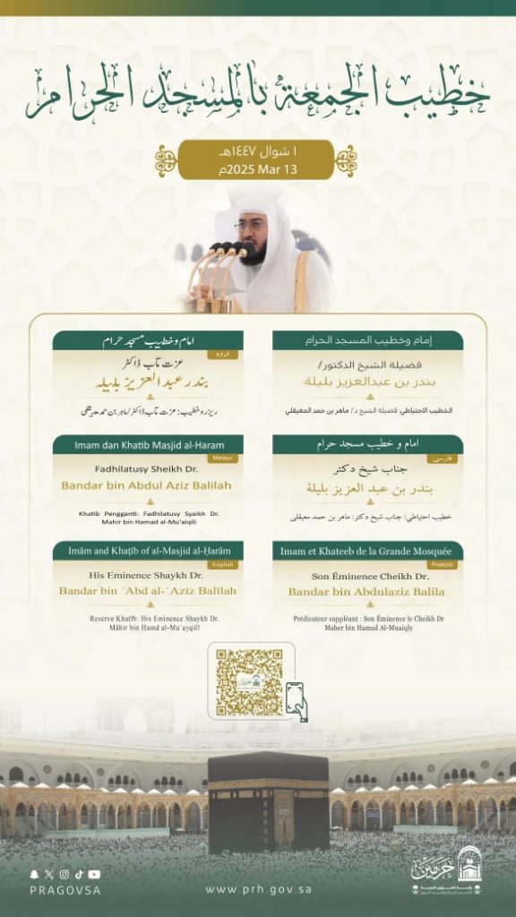 وسيتولى فضيلة الشيخ الدكتور بندر بليلة بإمامة المصلين وإلقاء خطبة الجمعة في المسجد الحرام.