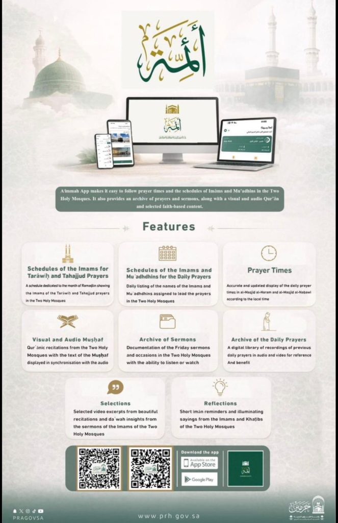 تطبيق “أئمة” ليكون رفيق زوار الحرمين الشريفين في متابعة مواقيت الصلوات، وجداول الأئمة والمؤذنين اليومية، مع أرشيف رقمي متكامل للتلاوات والخطب، إضافة إلى المصحف المرئي والمسموع وومضات إيمانية مختارة.