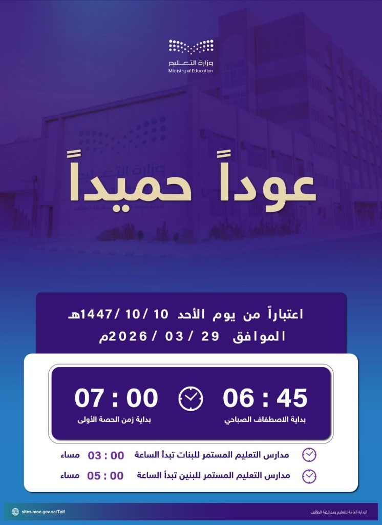 مواعيد بدء اليوم الدراسي اعتباراً من يوم الأحد 10/10/1447هـ الموافق 29/3/2026م