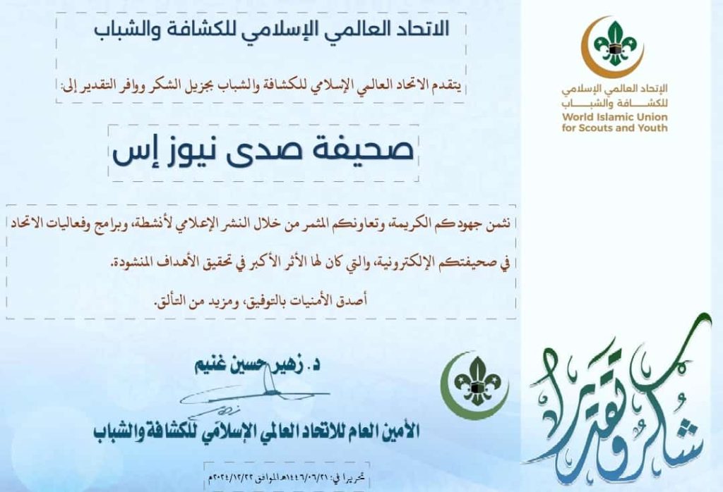 الإتحاد العالمي الإسلامي للكشافة والشباب، يثمن جهود صحيفة صدى نيوز إس الإخبارية، وتعاونها المثمر، ويمنحها شهادة شكر وتقدير وذلك لنشر اخبار الإتحاد
