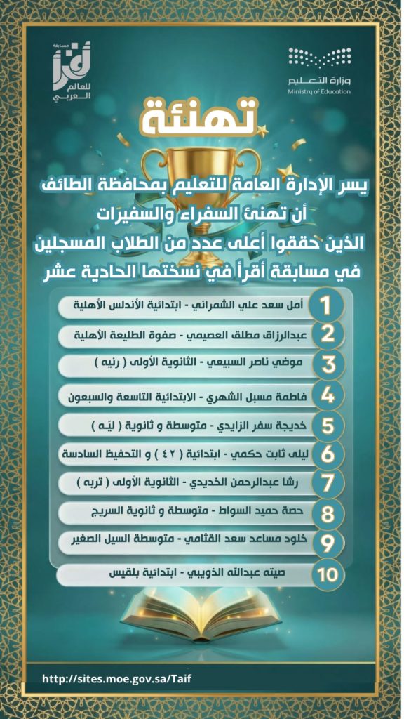 هنأت الإدارة العامة للتعليم بمحافظة الطائف الطلبة والمدارس الحاصلة على مراكز متقدمة في مسابقة “أقرأ” في نسختها الحادية عشرة، وذلك بعد تحقيقهم أعلى عدد من الطلاب المسجلين في المسابقة ضمن فئتي السفراء والمدرسة القارئة، في إنجاز يعكس الوعي المتنامي بأهمية القراءة ودورها في تنمية القدرات المعرفية لدى الطلبة.