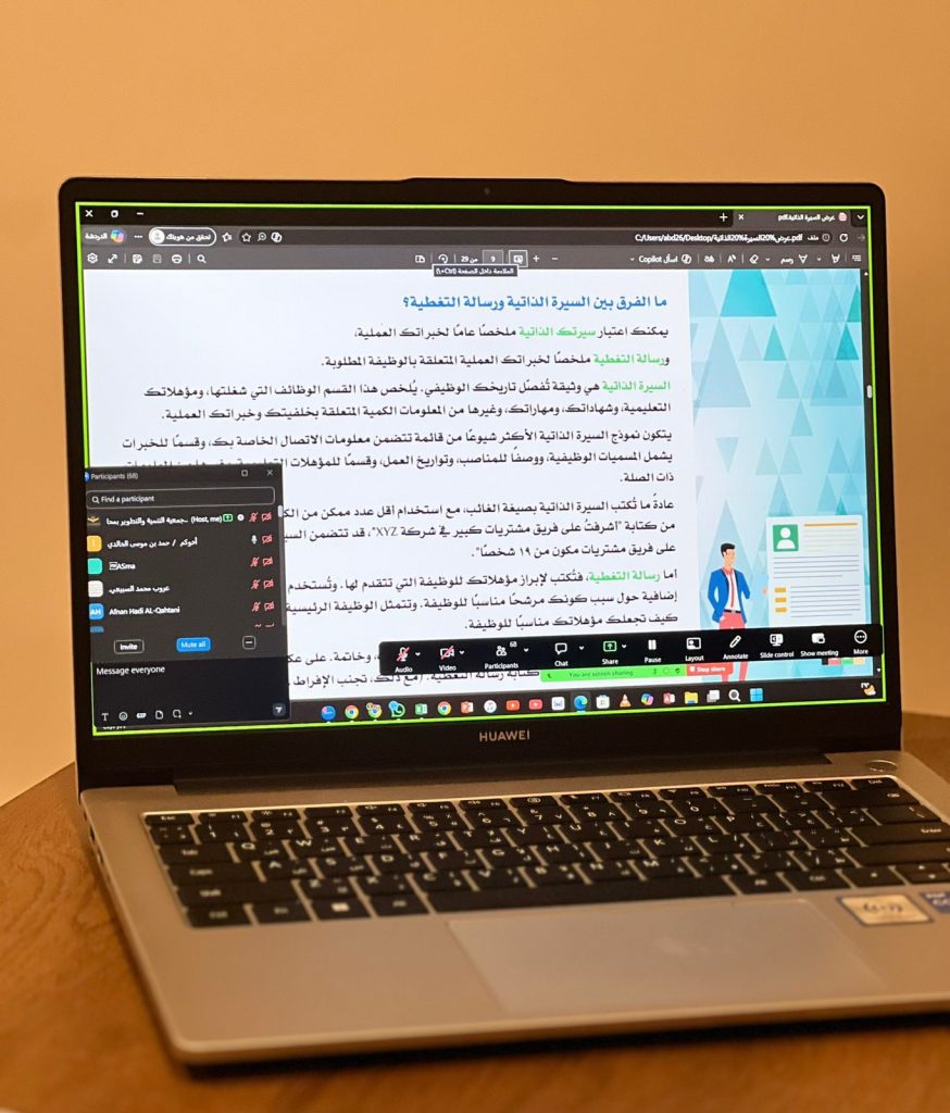 نظمت جمعية التنمية والتطوير بمحافظة الدوادمي برنامجًا تدريبيًا عن بعد بعنوان السيرة الذاتية الاحترافية ضمن جهودها في دعم وتأهيل الباحثين عن العمل وتنمية المهارات المهنية لدى أفراد المجتمع وشهد اللقاء حضور مجموعة كبيرة من المتدربين والمهتمين بتطوير مهاراتهم في إعداد السيرة الذاتية الاحترافية حيث تناول البرنامج أهم الأسس المهنية لكتابة السيرة الذاتية واستعراض أبرز الأخطاء الشائعة وطرق تحسين عرض الخبرات والمهارات بما يتوافق مع متطلبات سوق العمل وقدم البرنامج الأستاذ حمد بن موسى الخالدي وسط تفاعل من المشاركين مؤكدًا أهمية السيرة الذاتية كخطوة أولى نحو الحصول على الفرص الوظيفية المناسبة.