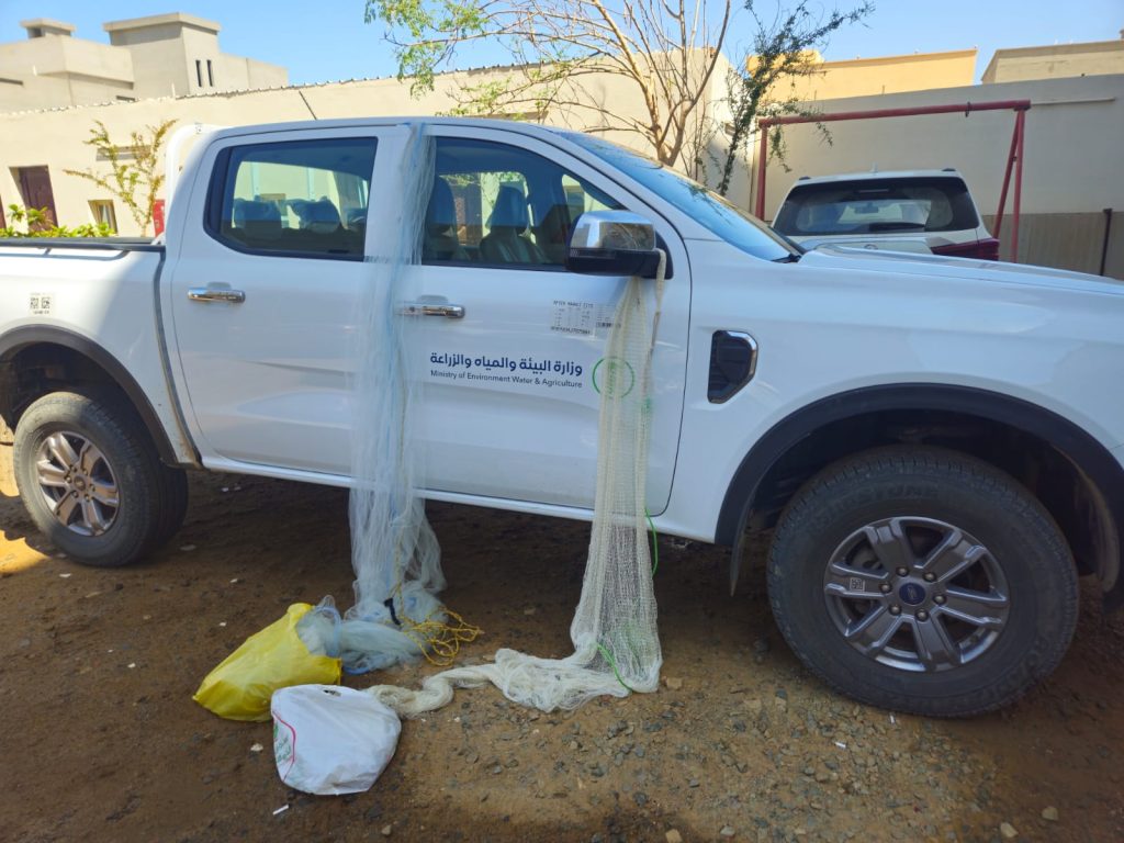 وعثر بحوزتهم على شباك صيد محظورة من نوع مخدجه المصنوعة من النايلون لما تسببه من أضرار على البيئة البحرية وتهديد للمخزون السمكي