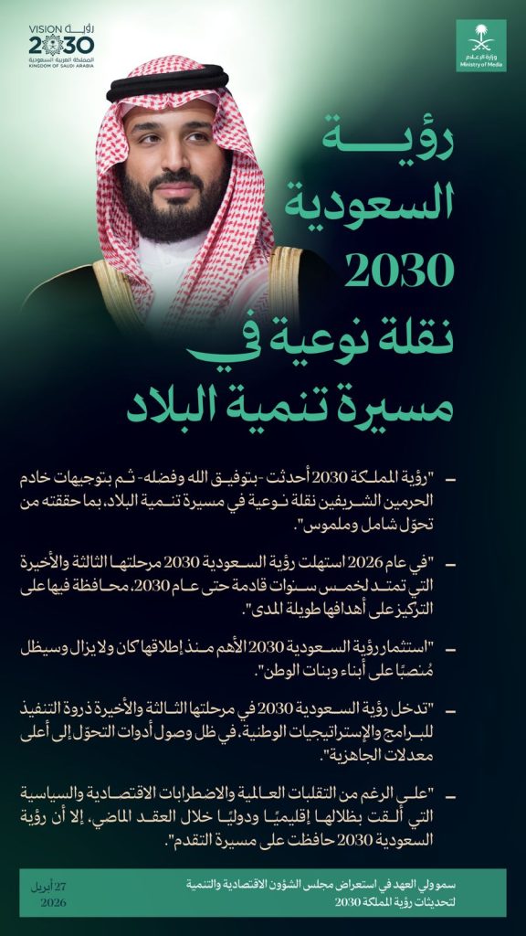 وأوضح سموه أن عام 2026 يشهد دخول الرؤية مرحلتها الثالثة والأخيرة، الممتدة حتى عام 2030، مع استمرار التركيز على تنفيذ البرامج الوطنية وتحقيق المستهدفات الإستراتيجية، بما يعكس حجم الطموح والإصرار على الوصول إلى مستقبل أكثر ازدهارًا واستدامة.