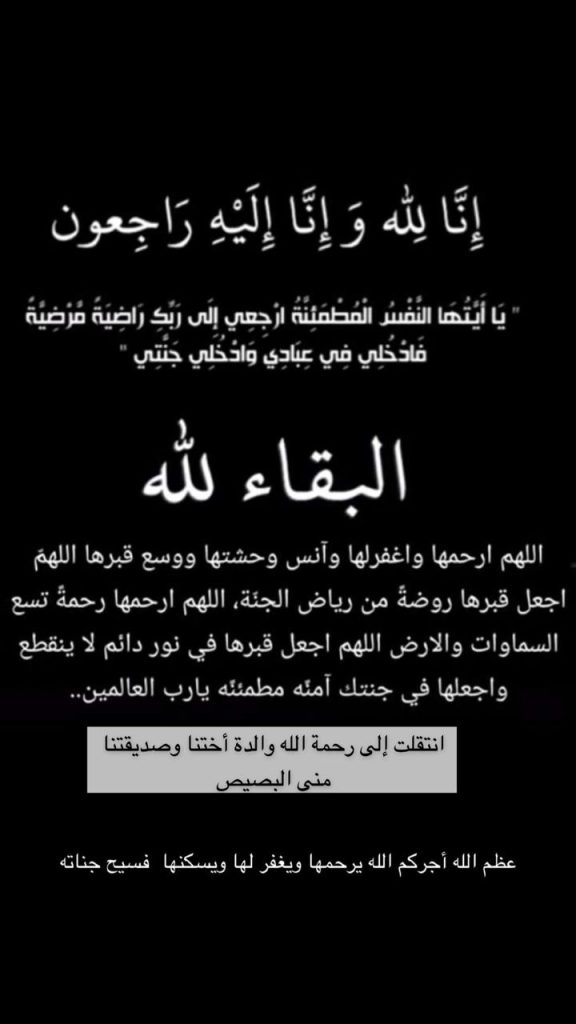 تتقدم صحيفة صدى نيوز s بخالص التعازي للأستاذة منى البصيص بوفاة والدتها (لطيفة المقيضيب) الله يرحمها ويغفر لها ويسكنها فسيح جناته ويلهم ذويها الصبر والسلوان