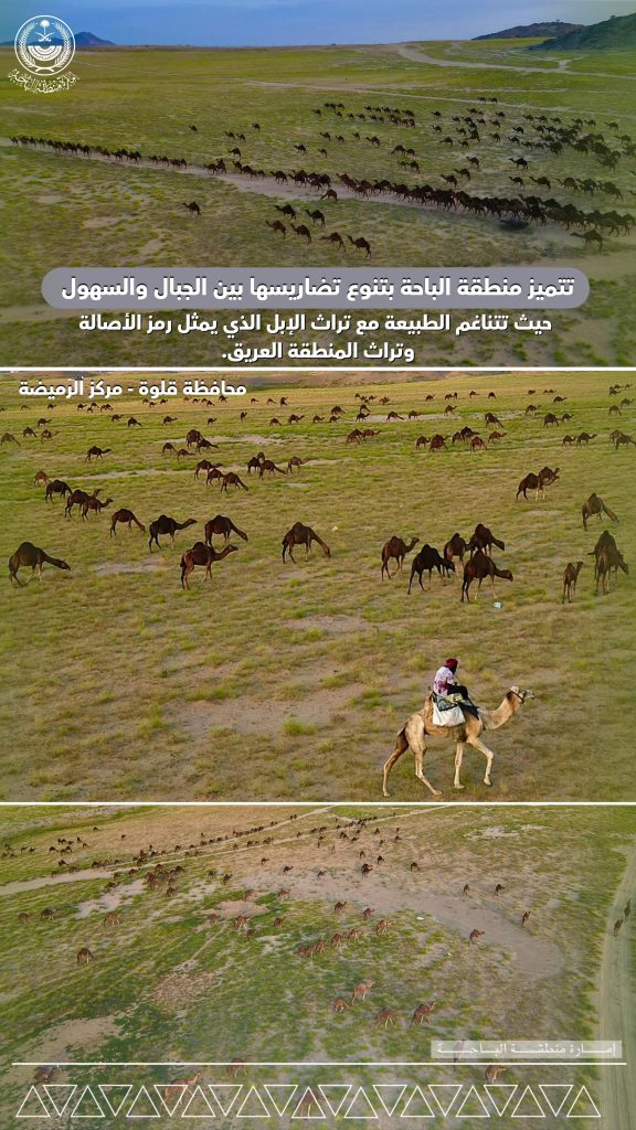 تعد منطقة الباحة إحدى الوجهات الفريدة في المملكة العربية السعودية التي تجسد تنوعًا استثنائيًا في طبيعتها الجغرافية، حيث تلتقي الجبال الشاهقة بالسهول الواسعة، لتخلق لوحة طبيعية آسرة تسلب الألباب. وفي قلب هذه المنطقة، وتحديدًا في محافظة قلوة بمركز الرميضة، تبرز مشاهد ساحرة تجمع بين سحر الطبيعة وأصالة التراث العربي، متمثلًا في الإبل التي ترعى بحرية في السهول الخضراء الممتدة.