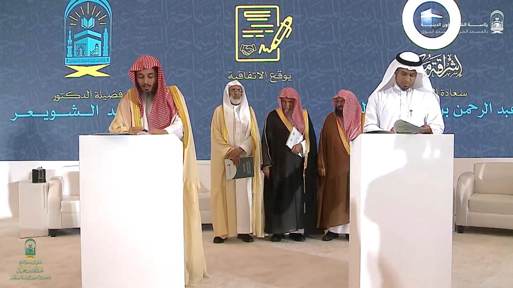 وقعت رئاسة الشؤون الدينية بالمسجد الحرام والمسجد النبوي مذكرة تعاون مع وقف إشراقة مكة للإنتاج الإعلامي وذلك لتعزيز التعاون المشترك بين الطرفين والممتد قرابة عقد ونصف من الزمن