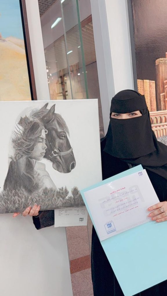 كما تحدثت الفنانة التشكيلية تهاني الوثلان بريشتها الناعمة المبدعة حب الفرس لصاحبها حيث ترجمة هذا الحب بصورة الفرس الحزينة لان صاحبتها حزينة