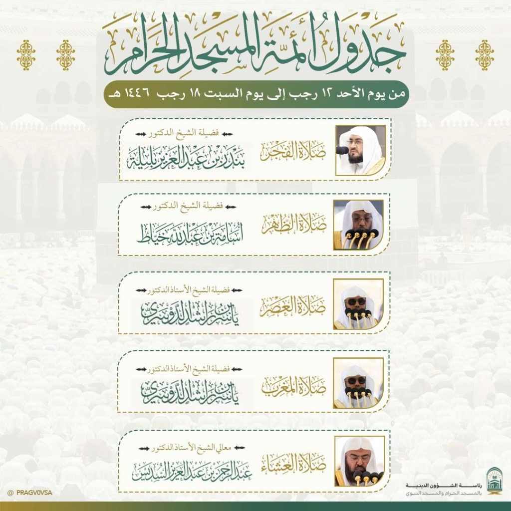 أوضحت رئاسة الشؤون الدينية بالحرمين الشريفين الجدول الأسبوعي لأئمة المسجد الحرام والمسجد النبوي