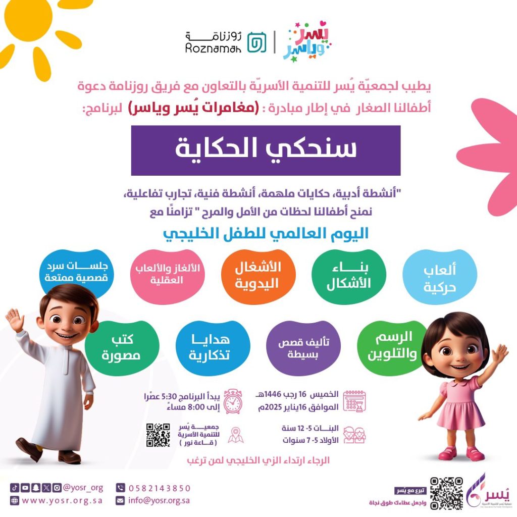 ضمن الأنشطة والبرامج والفعاليات والمبادرات التي تقوم بها جمعيّة يُسر للتنمية الأسريّة بمكة المكرمة تقيم الجمعية وبالتعاون مع فريق روزنامة مبادرة للأطفال الصغار وذلك في إطار مبادرة : (مغامرات يُسر وياسر) لبرنامج:(سنحكي الحكاية)