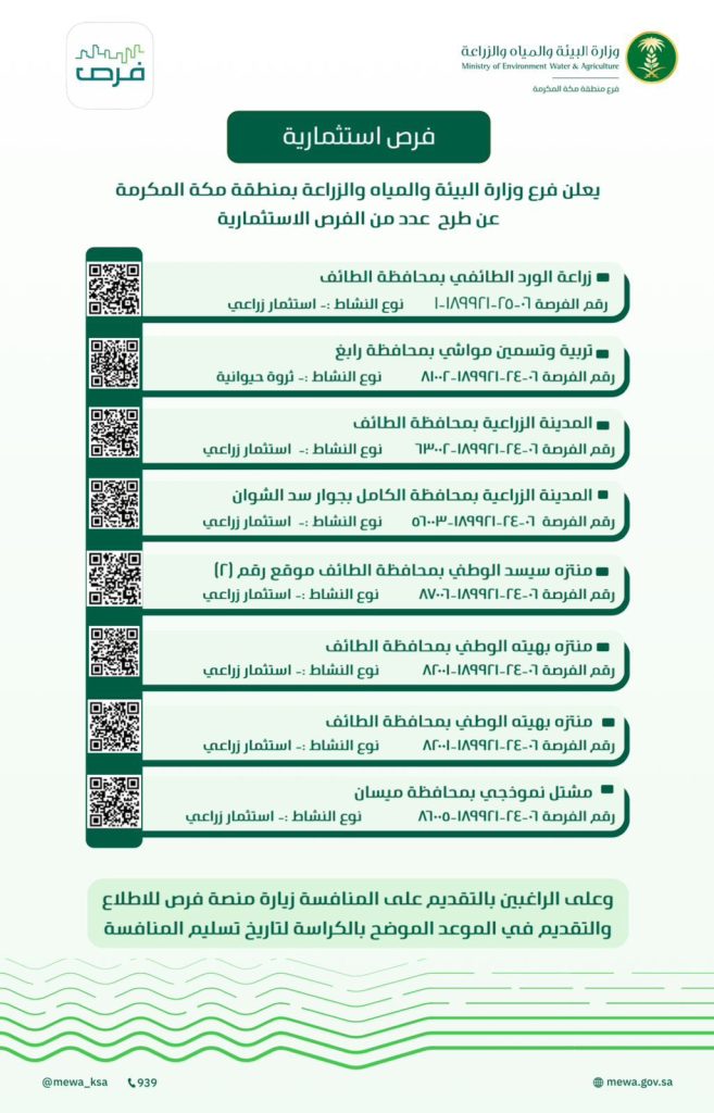 أعلن فرع وزارة البيئة والمياه والزراعة بمنطقة مكة المكرمة عن طرح ثمانية فرص استثمارية لمشاريع زراعية بمحافظات مختلفة بمنطقة مكة المكرمة بهدف إنتاج خضروات وفواكه عالية الجودة وكذلك تربية وتسمين المواشي، وزراعة الورد الطائفي وانشاء مشتل زراعي ، بالإضافة إلى متنزهات لأهالي المنطقة.