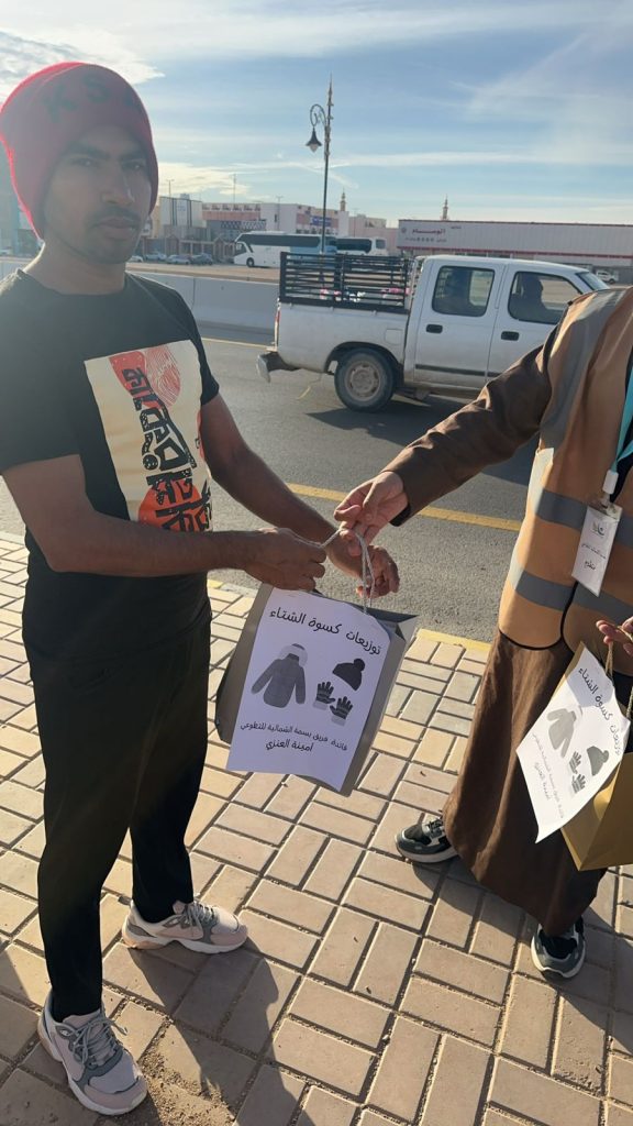 قام فريق بسمة شمالية التطوعي، بقيادة الأستاذة أمينة العنزي وأعضاء الفريق، بتوزيع كسوة الشتاء على 50 عاملاً من عمال النظافة وغيرهم من العمالة. تأتي هذه المبادرة في إطار الجهود الرامية لدعم الفئات المستحقة وتعزيز روح التعاون والمشاركة المجتمعية في منطقة الحدود الشمالية.