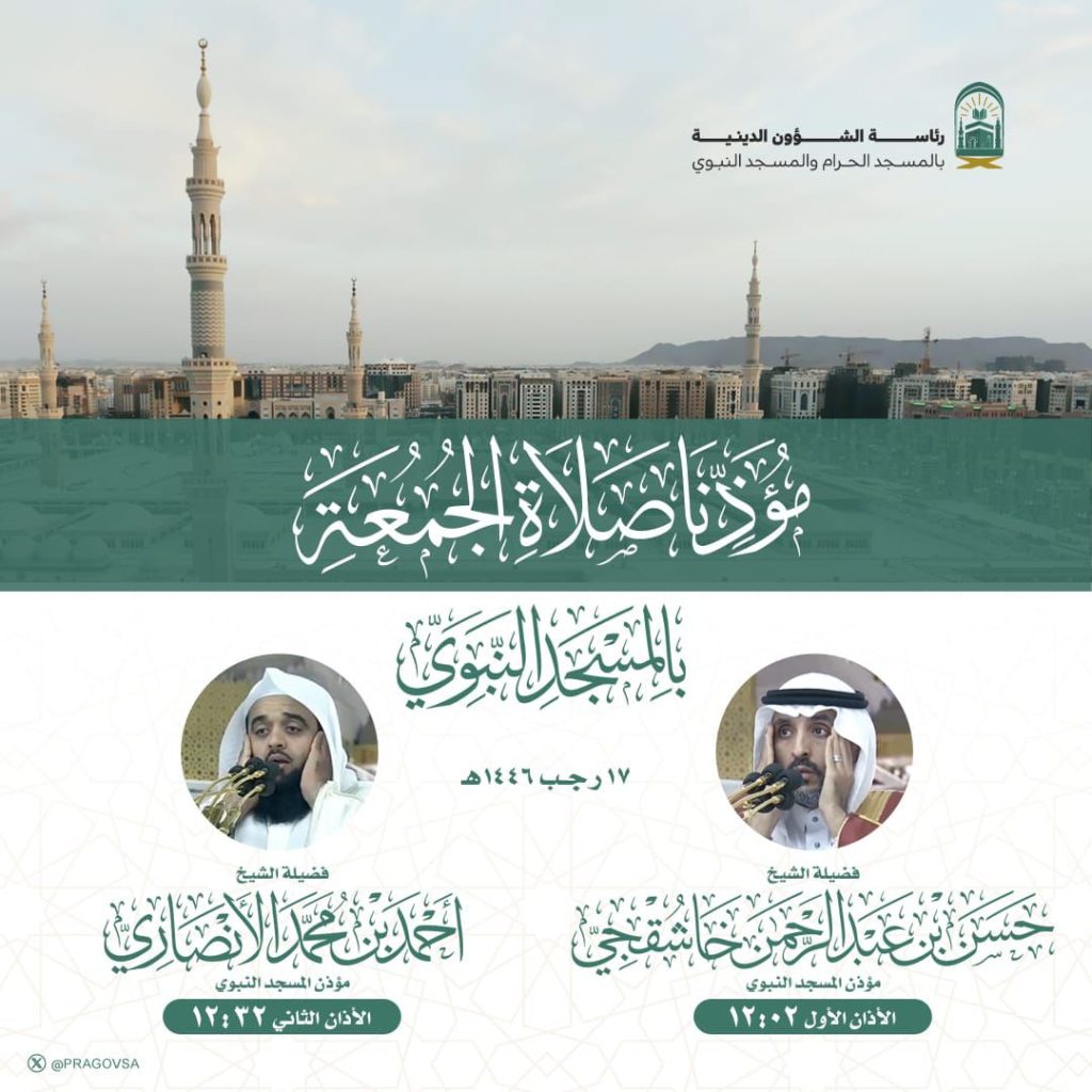 حددت رئاسة الشؤون الدينية بالمسجد الحرام والمسجد النبوي أسماء مؤذني صلاة الجمعة الموافق 17 رجب 1446هـ، في الحرمين الشريفين، وأوقات الأذان الأول والثاني، في إطار حرصها على تنظيم أوقات الصلاة وإبلاغ قاصدي وزائري الحرمين بأسماء المؤذنين.