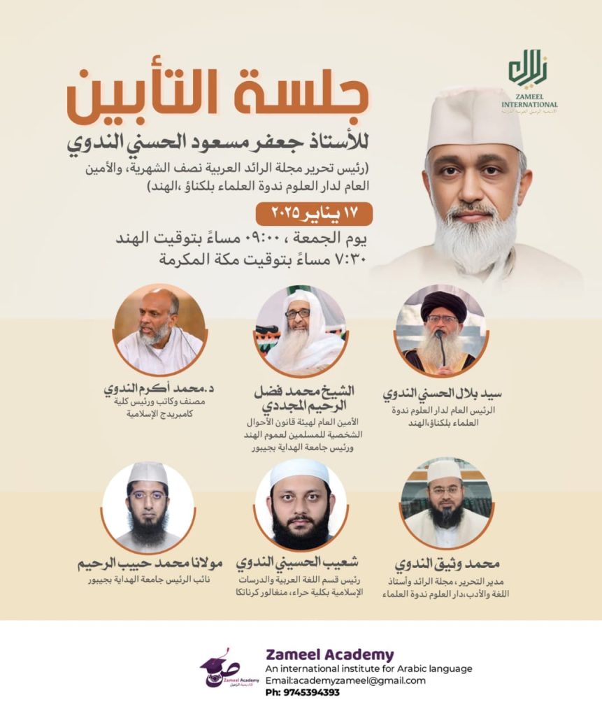 نظّمت أكاديمية الزميل بالهند، مساء يوم الجمعة 17 يناير 2025م، جلسة تأبينية مهيبة لإحياء ذكرى الأمين العام لندوة العلماء، السيد جعفر مسعود الحسني الندوي الذي وافته المنية قبل أيام إثر حادث سيارة مفجع.