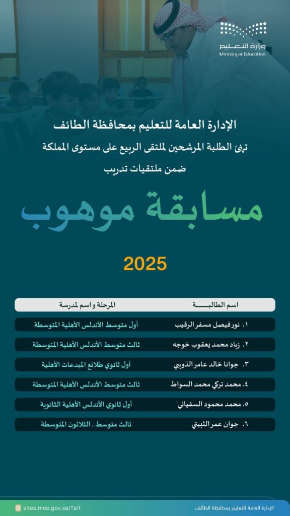 هنأت الإدارة العامة للتعليم بمحافظة الطائف الطلبة المرشحين لملتقى الربيع على مستوى المملكة ضمن ملتقيات تدريب مسابقة “موهوب” لعام 2025 وجاءت أسماء الطلبة المرشحين لتمثيل تعليم الطائف في المرحلة المقبلة على النحو التالي: نور فيصل مسفر الرقيب