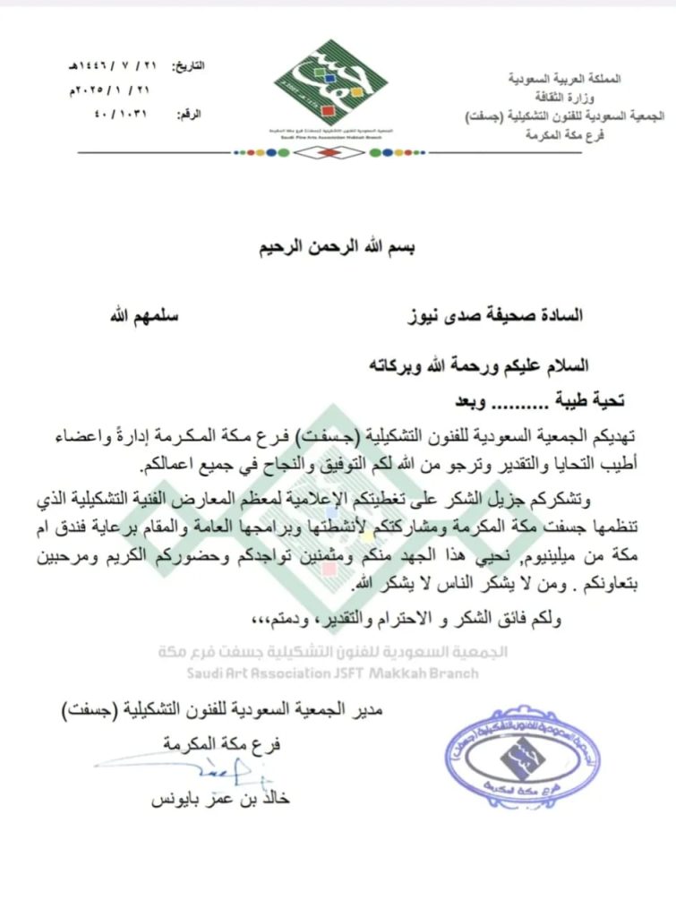 ببالغ التقدير و الإمتنان تلقينا خطابكم الكريم و الذي عبرتم فيه عن شكركم لما قمنا به من تغطية اعلامية لمعظم المعارض الفنية والتشكيلية الذي تنظمها جسفت فرع مكة المكرمة ، و كذلك مشاركتنا لأنشطتكم وبرامجكم العامة .. فإننا هنا نؤكد لكم مجددا وعلى الدوام بأننا نسعد بخدمتكم ومشاركتكم في كافة أنشطتكم التي من شأنها ان تكون إبراز لكل الأعمال الوطنية التي من شأنها ان تكون رفعة للوطن والمواطن ، وهذا حق وواجب علينا القيام به كصحيفة وطنية تتطلع الى المصلحة الوطنية العامة .. وبمثلما أنكم تؤدون واجبكم الوطني فهذا يجب علينا كصحيفة أن نقف ألى جانبكم ونكون رهن إشارتكم فيما يجب علينا القيام به تجاهكم وتجاه كل الفعاليات والأنشطة بما فيه خدمة للوطن والمواطن ..